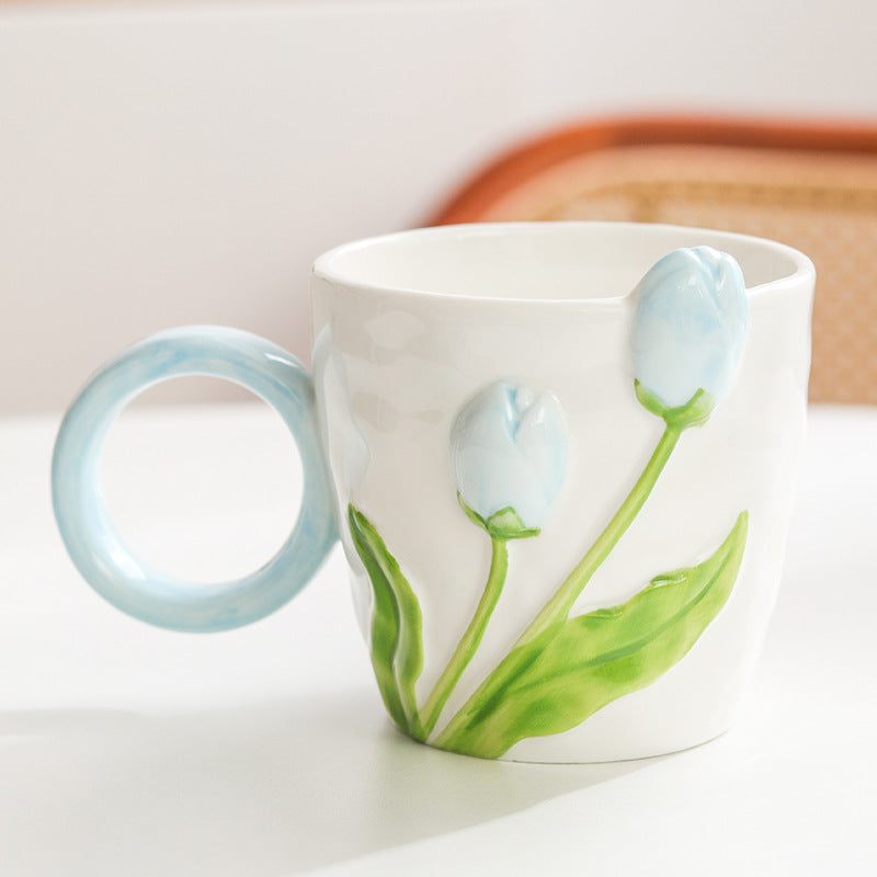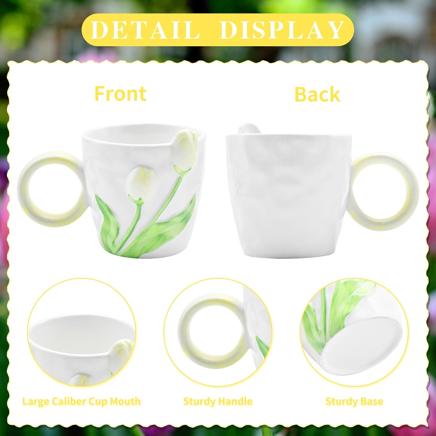 Crafted from high-quality ceramic, each mug features a unique, curved handle inspired by a tulip stem, offering both visual interest and a comfortable hold. The subtle, pastel color palette and lifelike floral details provide a fresh and serene backdrop for your morning beverage or an afternoon pause.