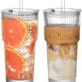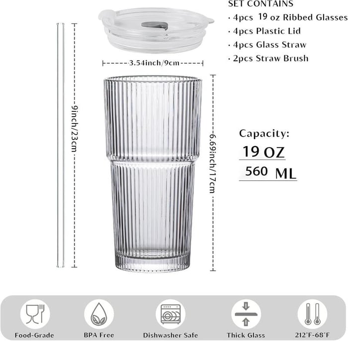 These 19oz ribbed glass tumblers are designed as a comprehensive drinkware solution. The set includes four tumblers, four lids, four glass straws, and two cleaning brushes. They are engineered to accommodate a wide range of beverages, from iced coffee and smoothies to juice and cocktails. The combination of form and function makes them suitable for various settings, whether for daily personal use or social gatherings.