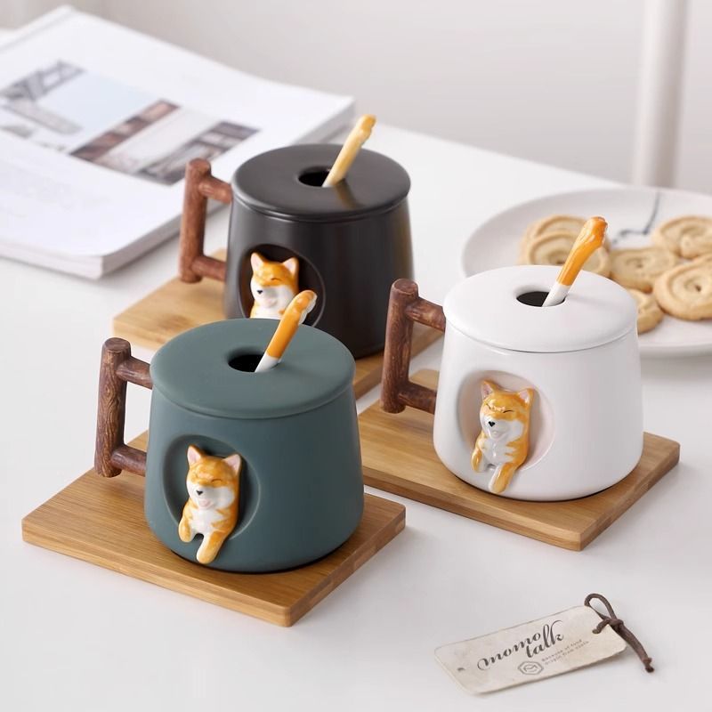 This mug has a 14-ounce (approximately 413 ml) capacity and measures 5.2 x 3.66 x 3.74 inches (approximately 13.2 x 9.3 x 9.5 cm). The mug has a matte finish and a wood-grain handle for a comfortable and natural grip. The product includes a matching ceramic lid and a paw-shaped spoon.