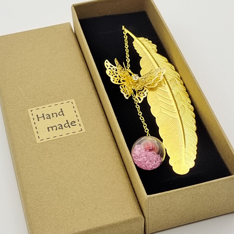 The Angel's Feather is a meticulously crafted metal bookmark, designed for both functionality and aesthetic elegance. It combines a delicate feather with a three-dimensional butterfly pendant, connected by a fine metal chain and finished with a unique glass bead accent. Ideal for book lovers and collectors, this piece adds a touch of sophistication to any reading experience.