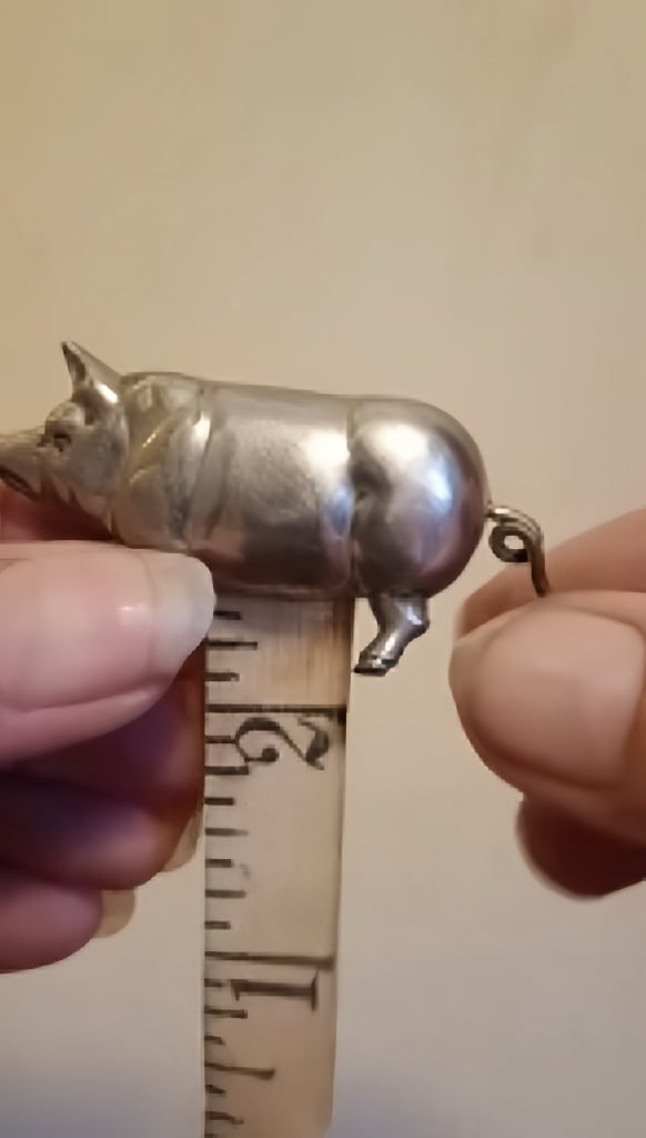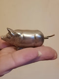 This miniature tape measure features a pig-shaped design, combining visual appeal with measuring functionality. The vintage-style nickel-plated brass finish provides a classic appearance suitable for sewing and crafting spaces.