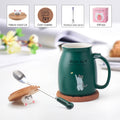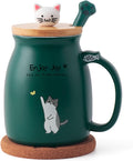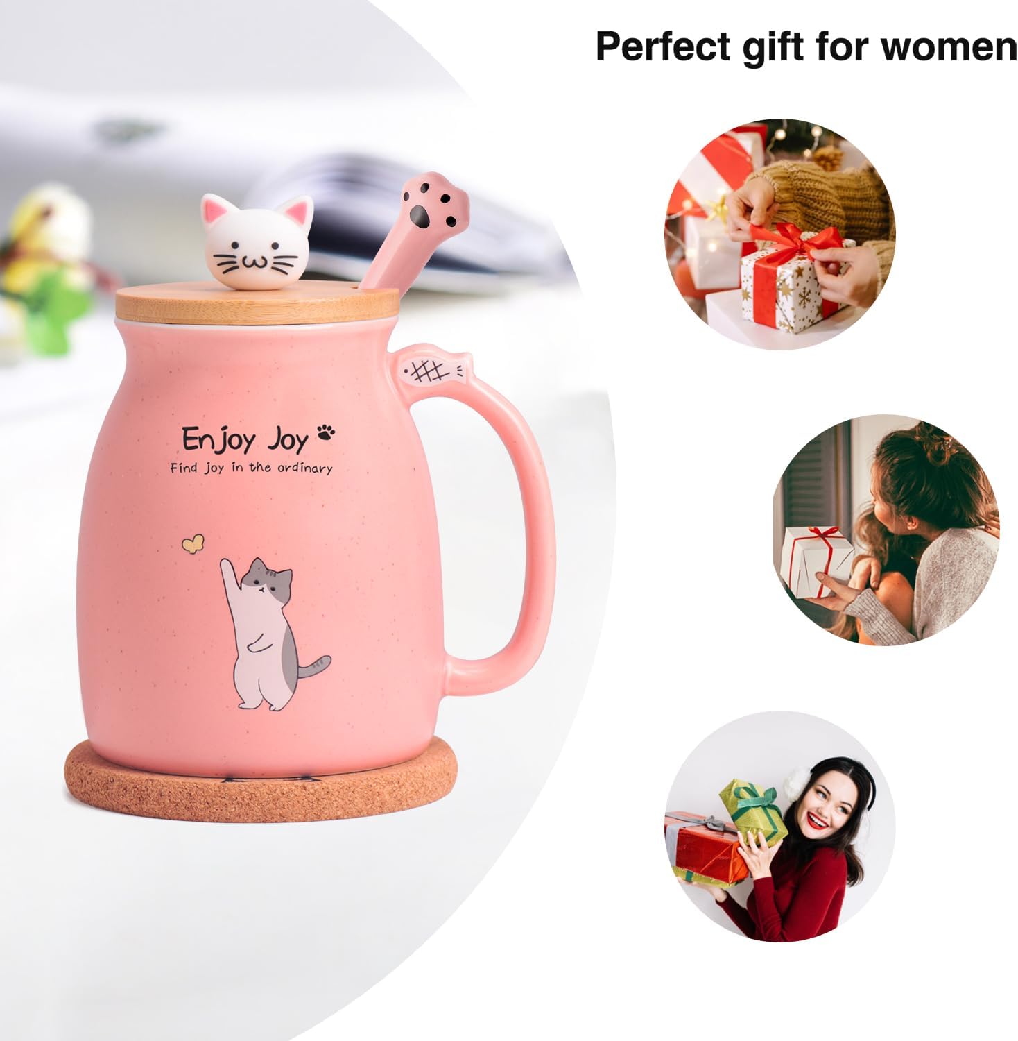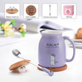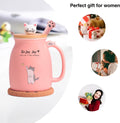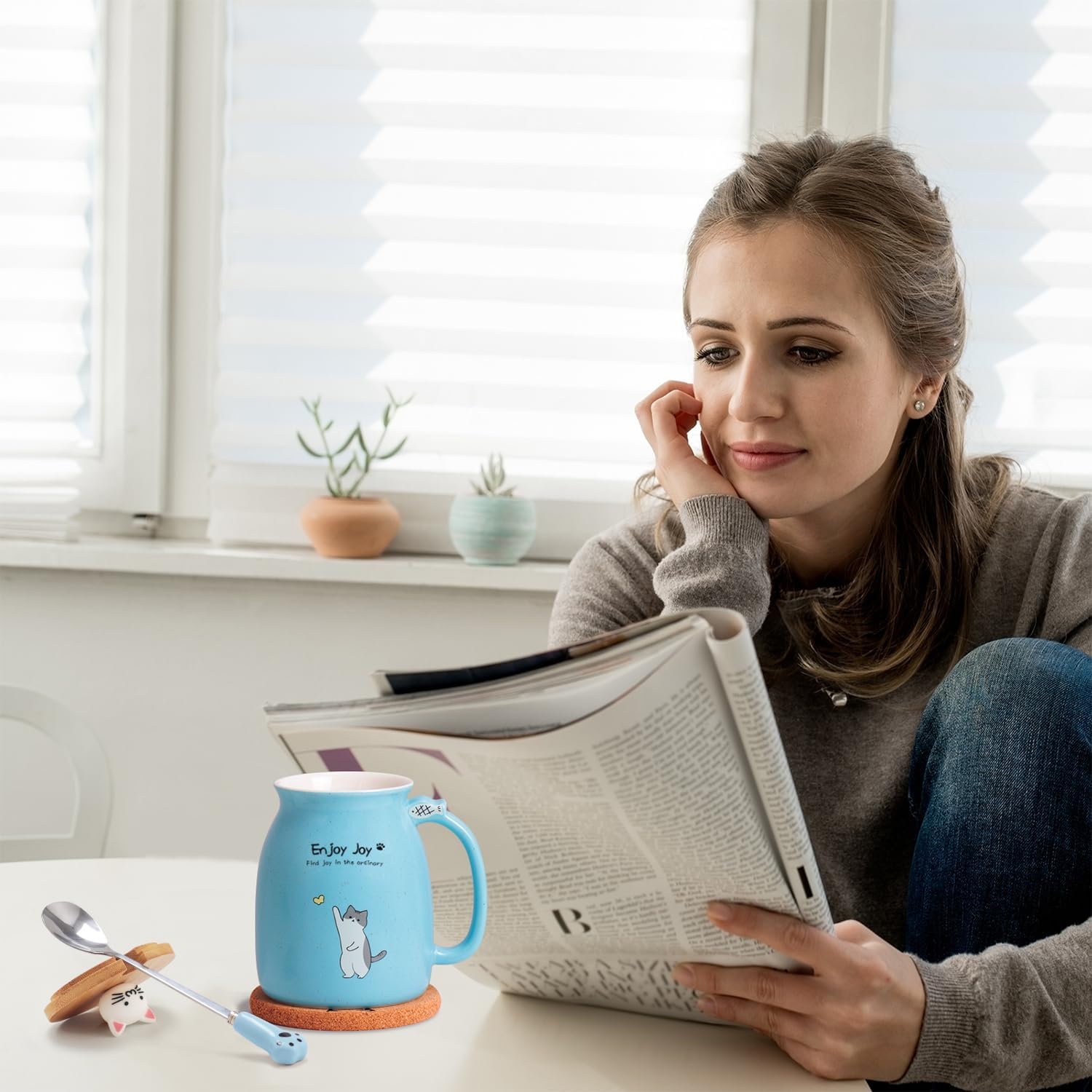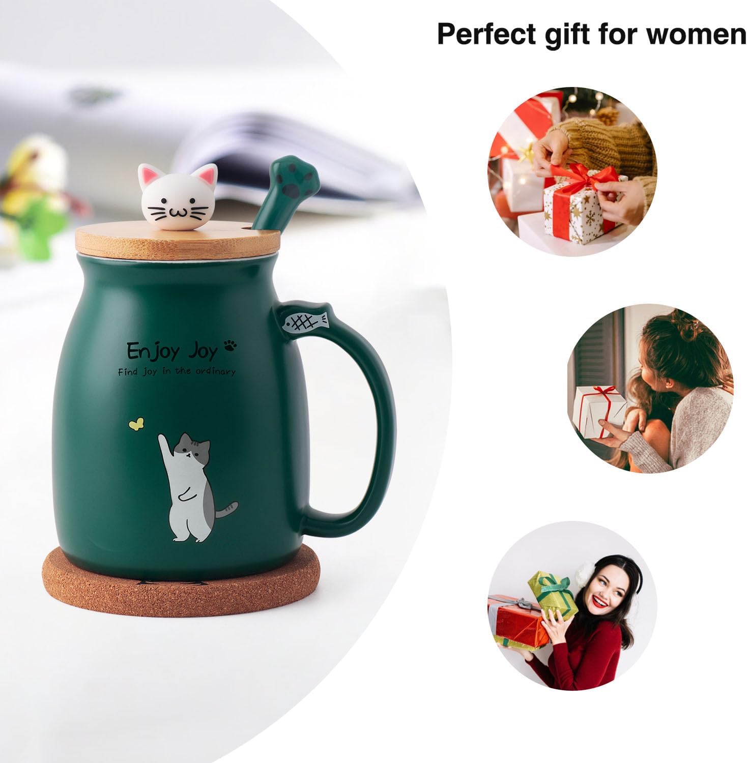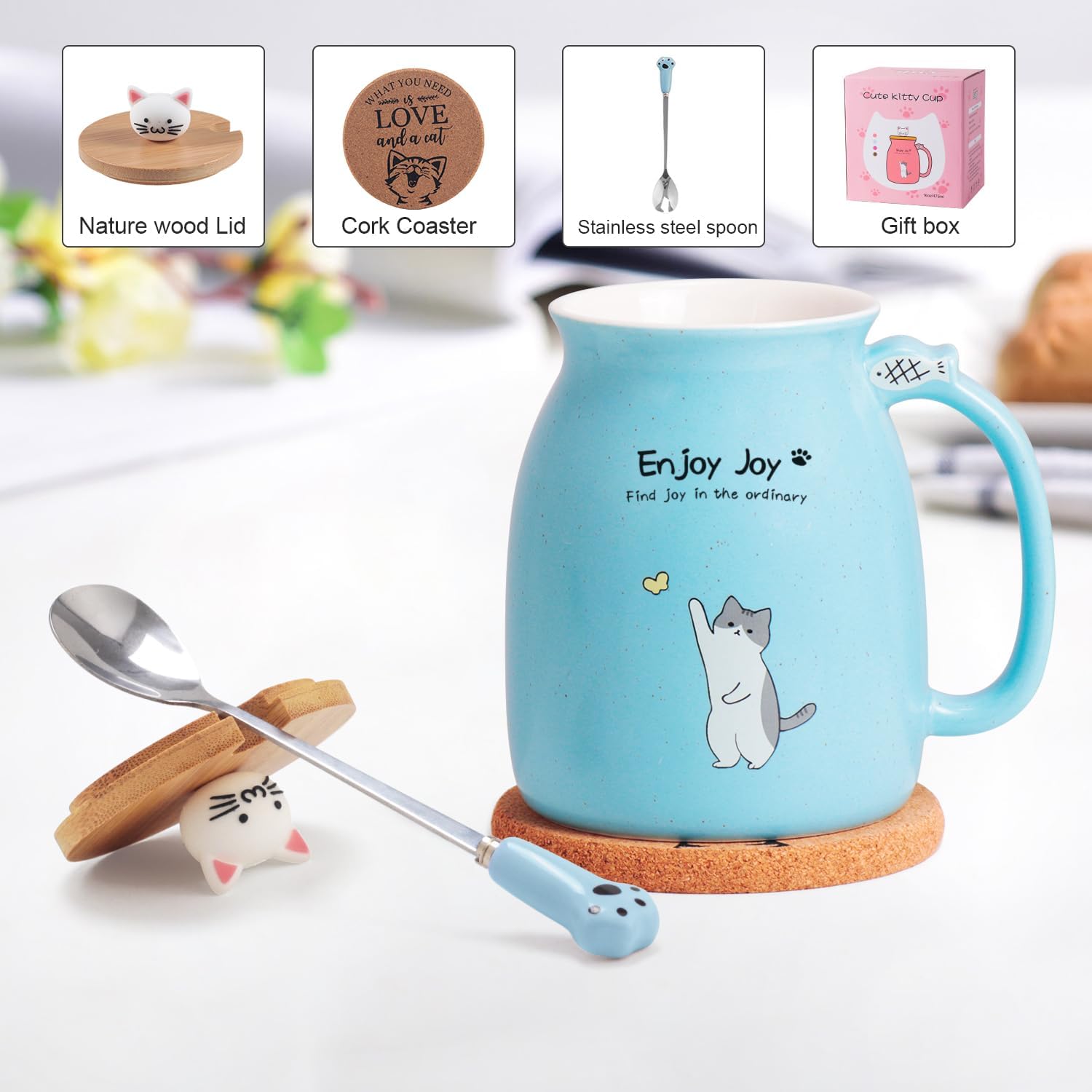 Included with the mug are three complementary accessories: a natural bamboo lid topped with a soft, food-grade silicone cat head, a sturdy 304 stainless steel spoon, and a thick wooden coaster adorned with a matching cartoon cat design. The lid includes a convenient U-shaped slot to hold the spoon securely and minimize dust entry.