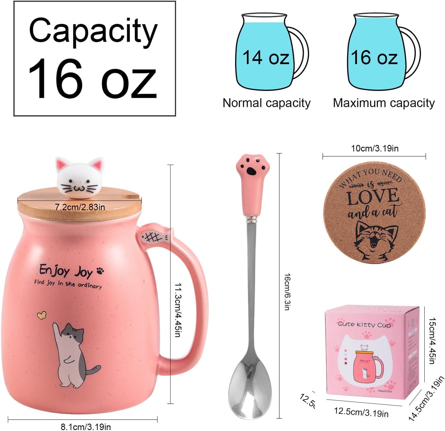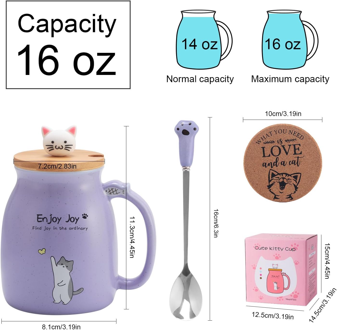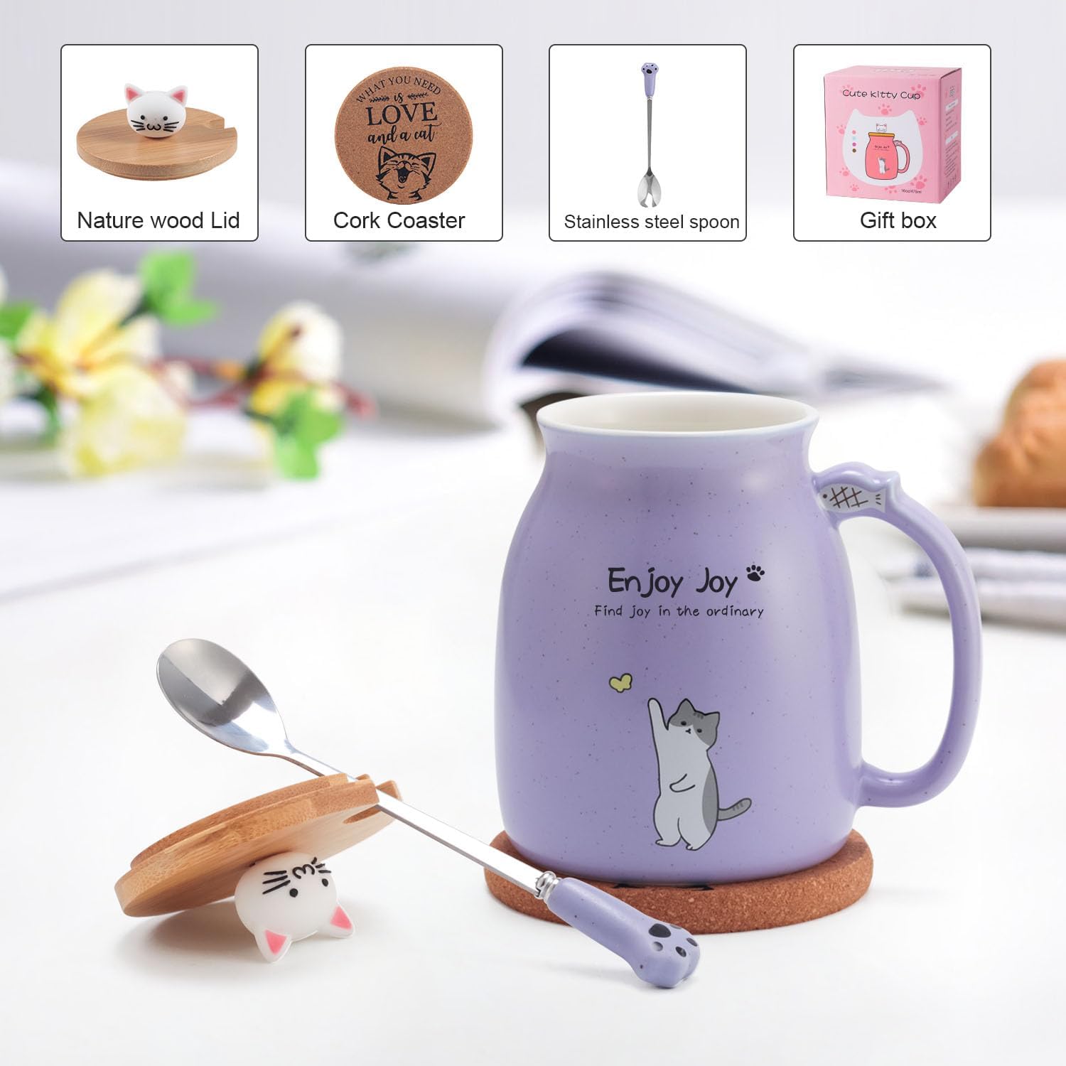 Includes: Mug, bamboo lid with silicone cat topper, stainless steel spoon, wooden coaster