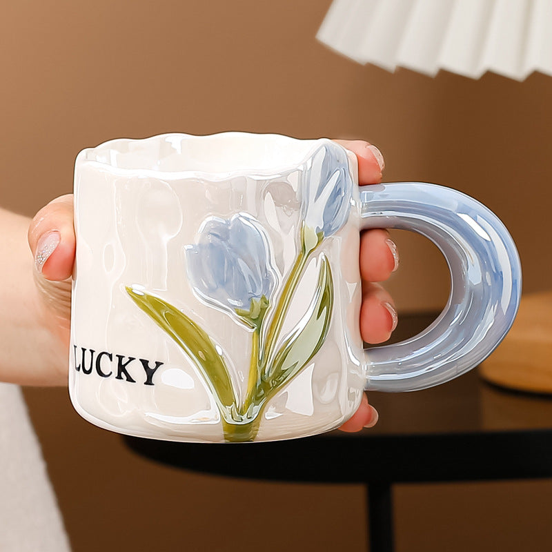 Tulip-Inspired Design: The mug’s elegant tulip shape and floral detailing provide a decorative touch.