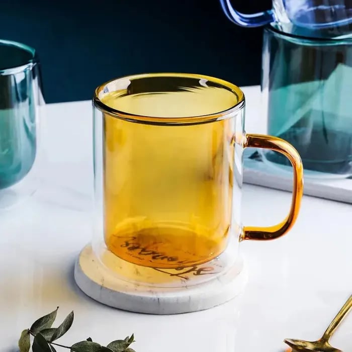 Experience the balance of form and function with our Colourful Glass Double-Walled Coffee Mug. This mug is engineered for the daily ritual of enjoying a hot beverage, combining a vibrant aesthetic with practical thermal properties.