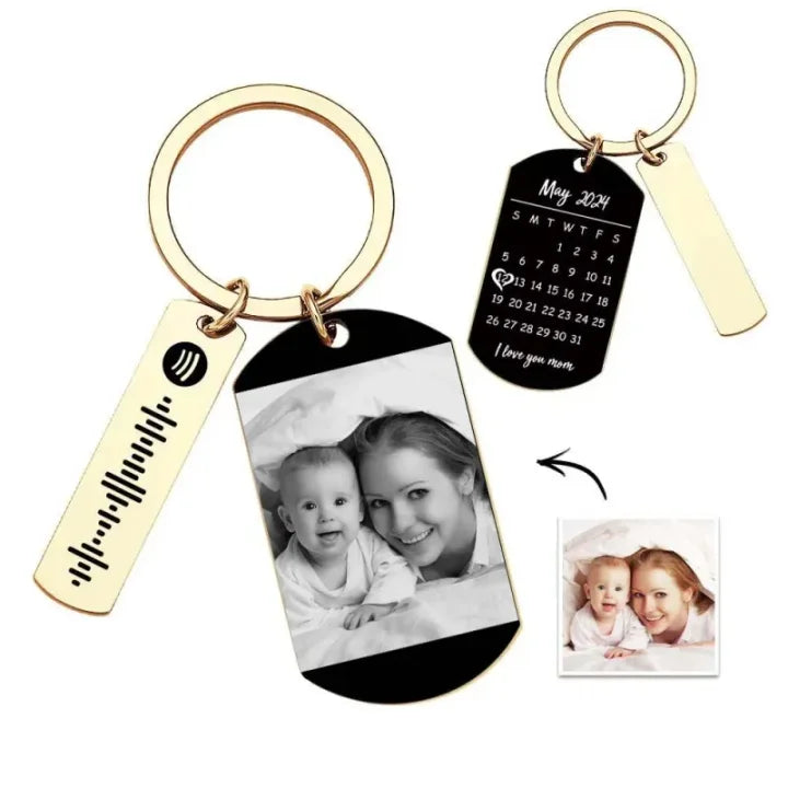 This keychain is a customizable accessory designed to hold personal significance. It integrates a selected photograph, a specific calendar date, and a scannable Spotify code into a single compact design.