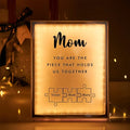 This LED light box features a customizable puzzle design, allowing you to engrave the names of family members. It serves as a personalized home décor piece, often used to express appreciation for mothers or family unity. The design incorporates the phrase “You Are The Piece That Holds Us Together” alongside up to six custom names.