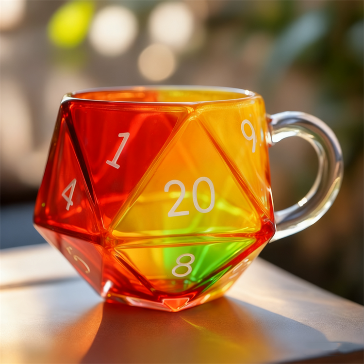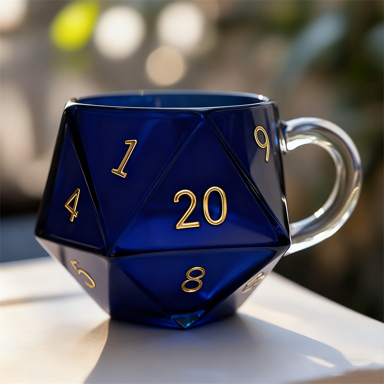 Inspired by the iconic 20-sided dice used in tabletop role-playing games, this glass mug brings a distinctive touch to any drinkware collection. Its detailed polyhedral design features clearly marked numbers from 1 to 20, replicating the appearance of a standard D20 die.