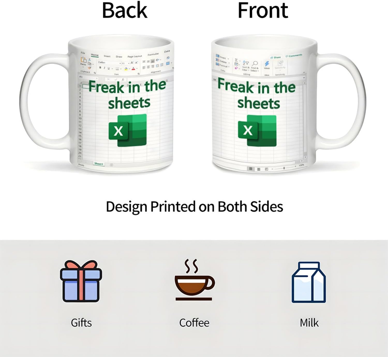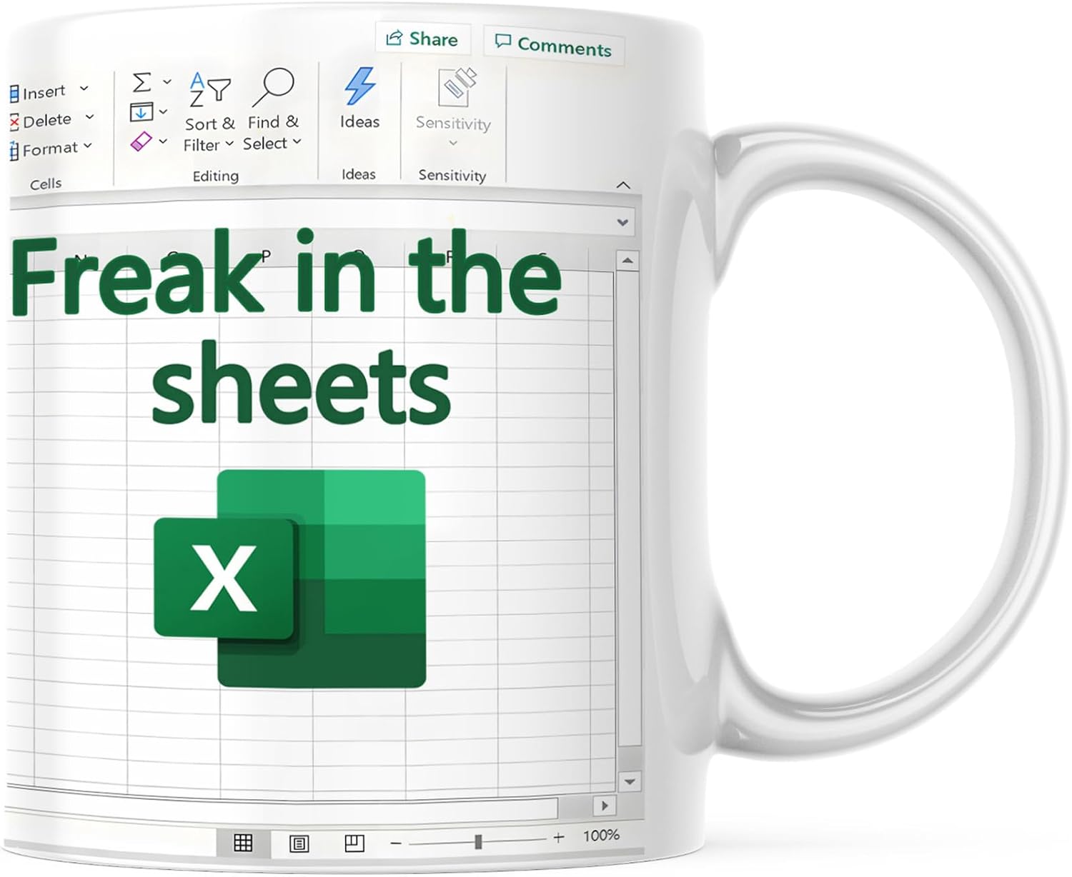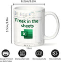 This ceramic coffee mug showcases a detailed Excel spreadsheet design paired with the humorous quote, "Freak In The Sheets." Designed to resonate with individuals in accounting, finance, and office environments, the mug adds a lighthearted touch to daily routines.