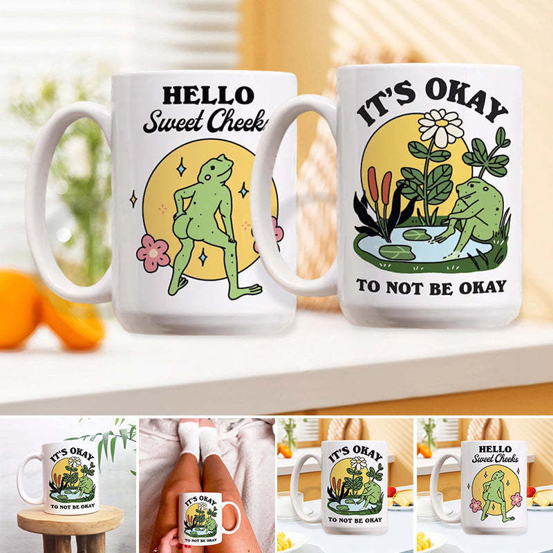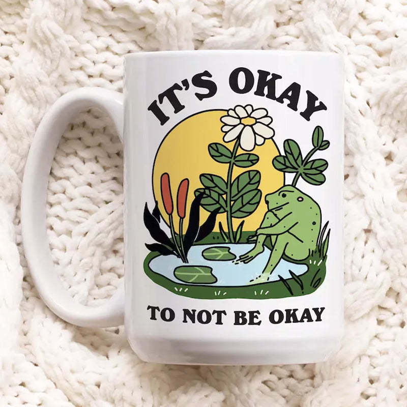 This ceramic coffee mug features a whimsical frog illustration paired with the supportive phrase, "It's okay to not be okay." Designed to bring a touch of warmth and reassurance to daily routines, it serves as a comforting companion for quiet moments of reflection.