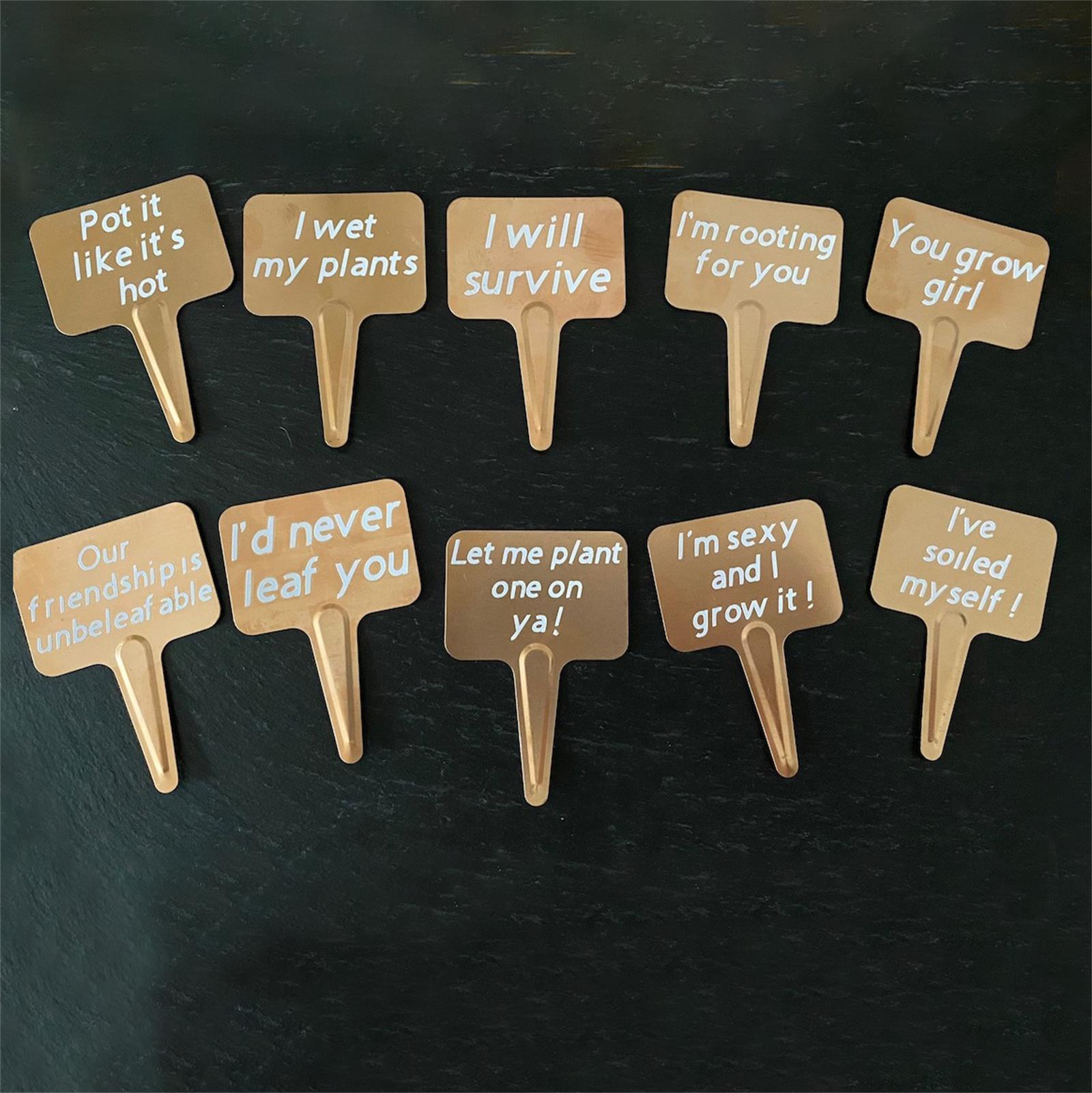 Metallic Plant Labels Set Includes the following 10 cheeky phrases: