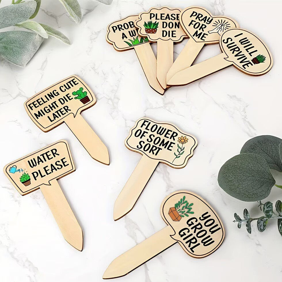Wooden Plant Labels Set Includes the following 15 humorous phrases: