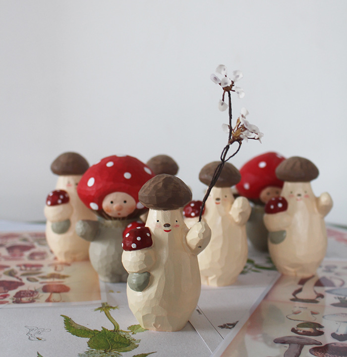 Hand-Carved Mushroom Girl Figurine with Red Balloon