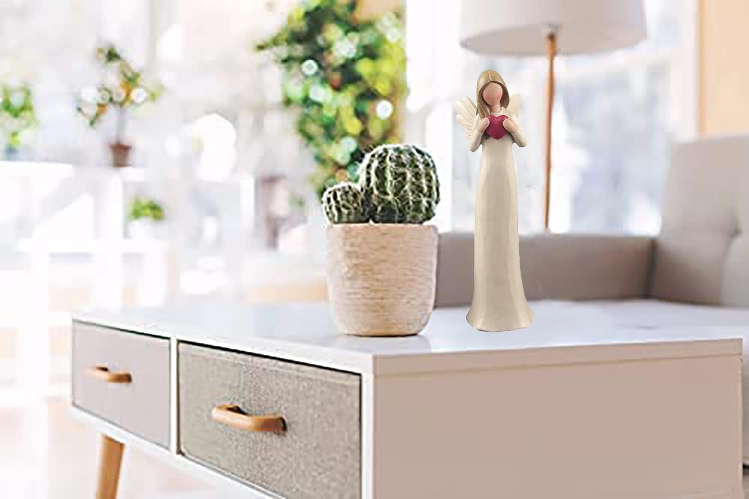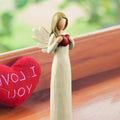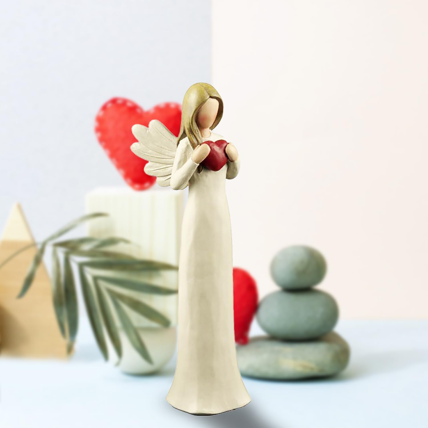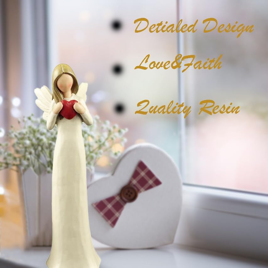 A delicate cream-colored angel figurine gracefully holds a red heart, symbolizing love and warmth. This meticulously hand-painted resin statue brings a sense of serenity and elegance to any space. Designed with intricate details, the angel’s gentle expression and flowing form reflect artistry and care, making it a meaningful decorative piece for your home or a thoughtful gift for someone special.