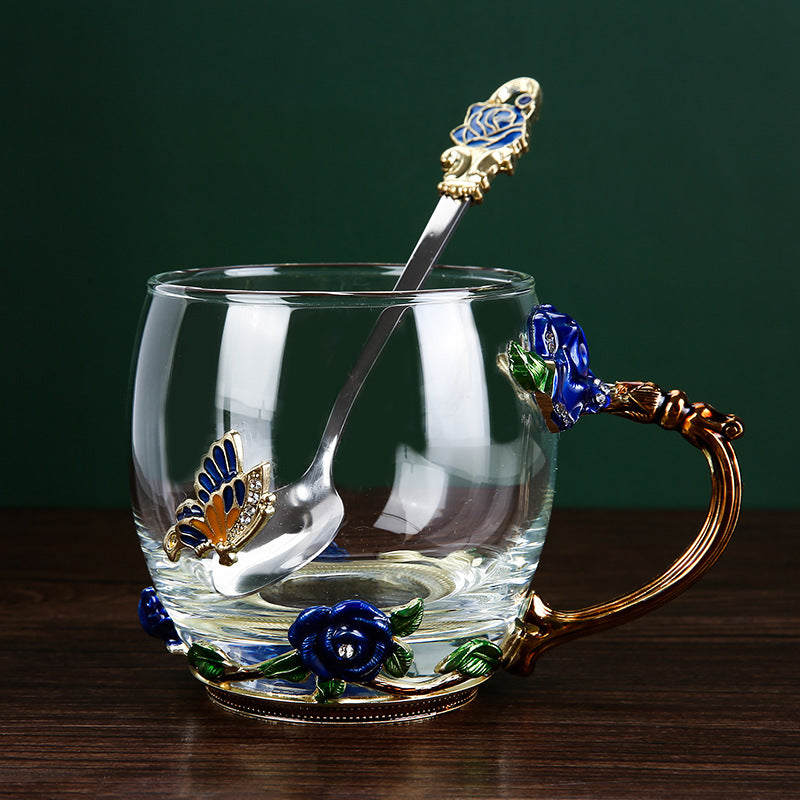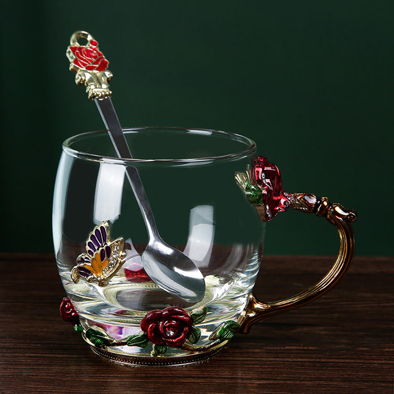 Handmade Floral Butterfly Enamels Glass Mug with Spoon