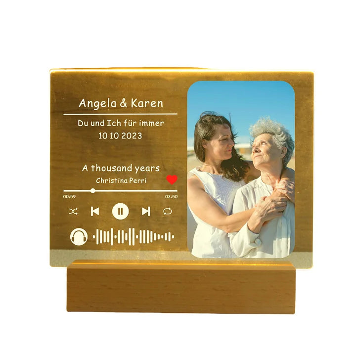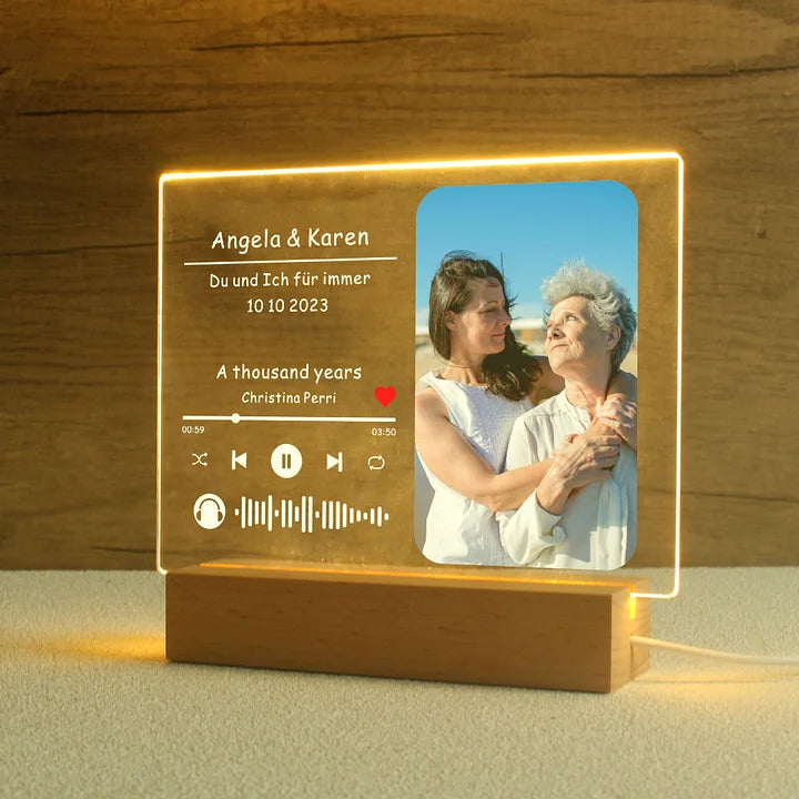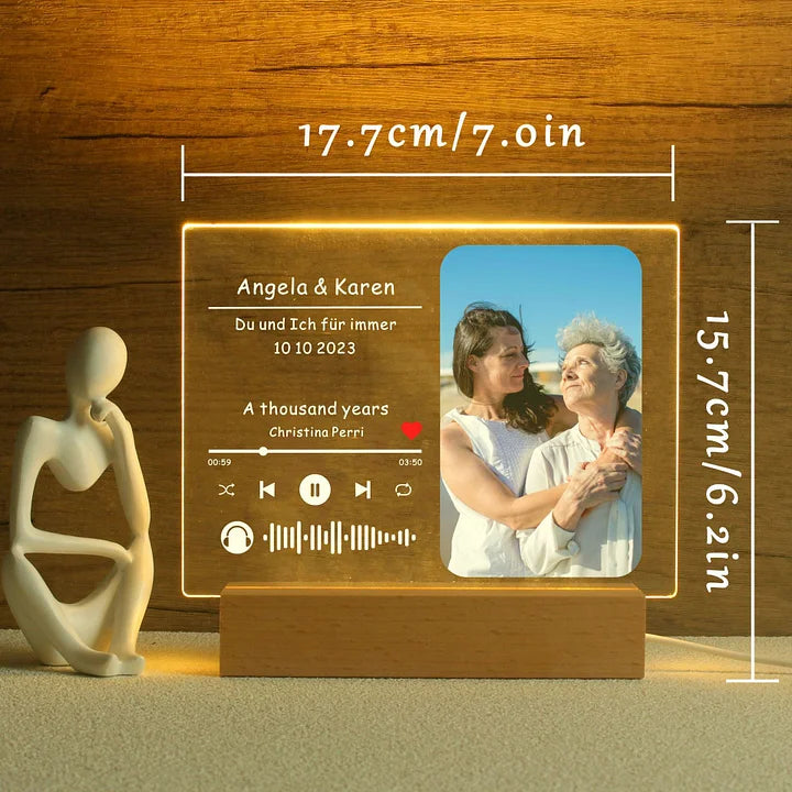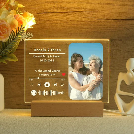 This product is a dual-function LED photo frame and music player. Constructed from acrylic and wood, it features a built-in area for a custom photograph and incorporates a personalization option for a name or short text. The unit serves as a decorative light source and an audio player, designed for tabletop or shelf display.