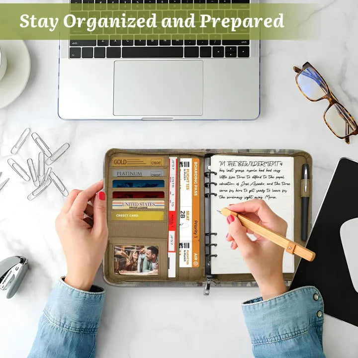 Its interior includes multiple compartments, card slots, tilted pockets, a transparent window pocket, and a pen ring to organize items such as files, notepads, pens, and small devices. The compact and lightweight design facilitates carrying for meetings, travel, or daily commuting.