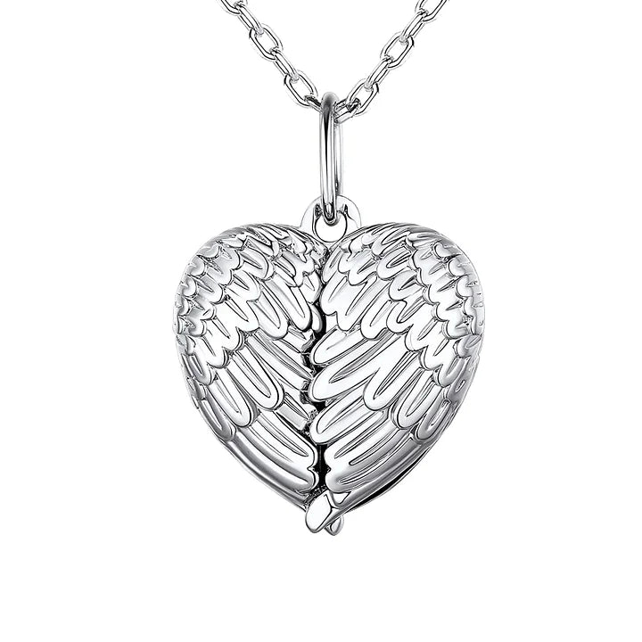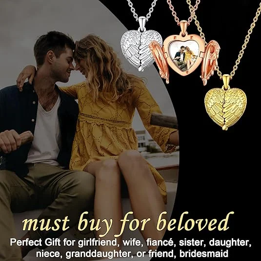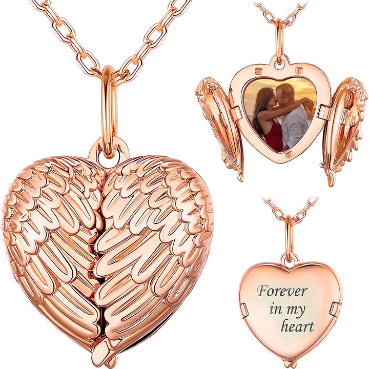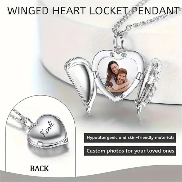 This necklace features a heart-shaped locket with angel wing design, which can be customized with a photograph and an engraved name. It is designed to hold personal significance and may serve as a keepsake for various occasions. The piece is constructed from plated metal and includes an adjustable chain. Engraving is performed using laser technology for precision and durability.