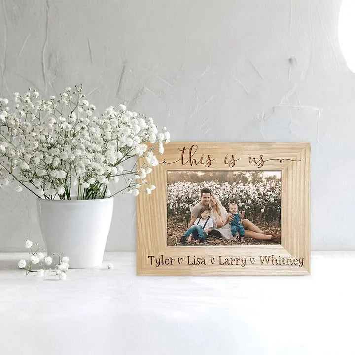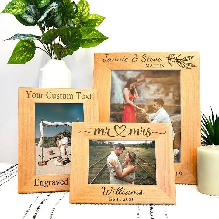 The frame can be customized with engraved text or designs, including names, dates, brief messages, or simple symbols. This option allows the frame to serve as a tailored gift for occasions such as weddings or birthdays, or as a personal keepsake.