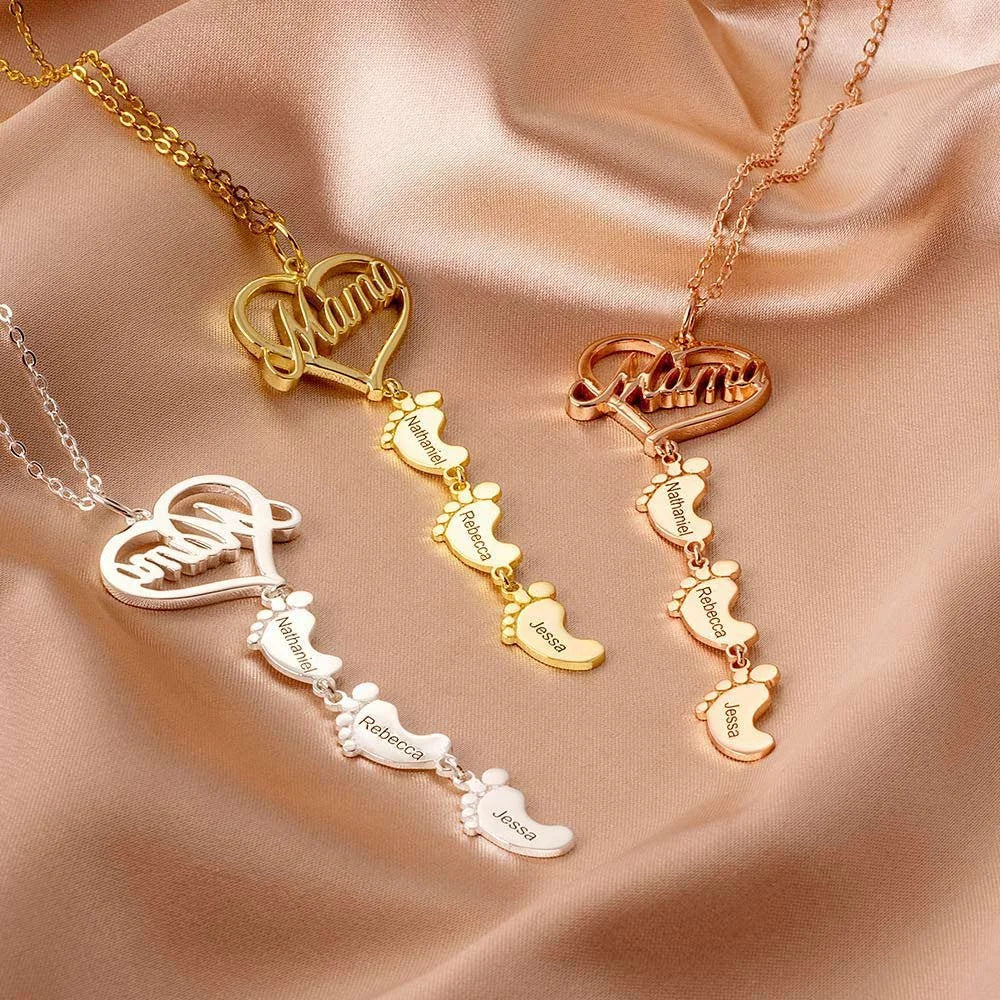 This necklace is designed as a symbol of the bond between a mother and her child. It features a heart-shaped pendant that can be customized with up to three baby footprint charms, each engraved with a name of your choice. The piece is intended to serve as a keepsake for mothers, representing the lasting connection with their children.