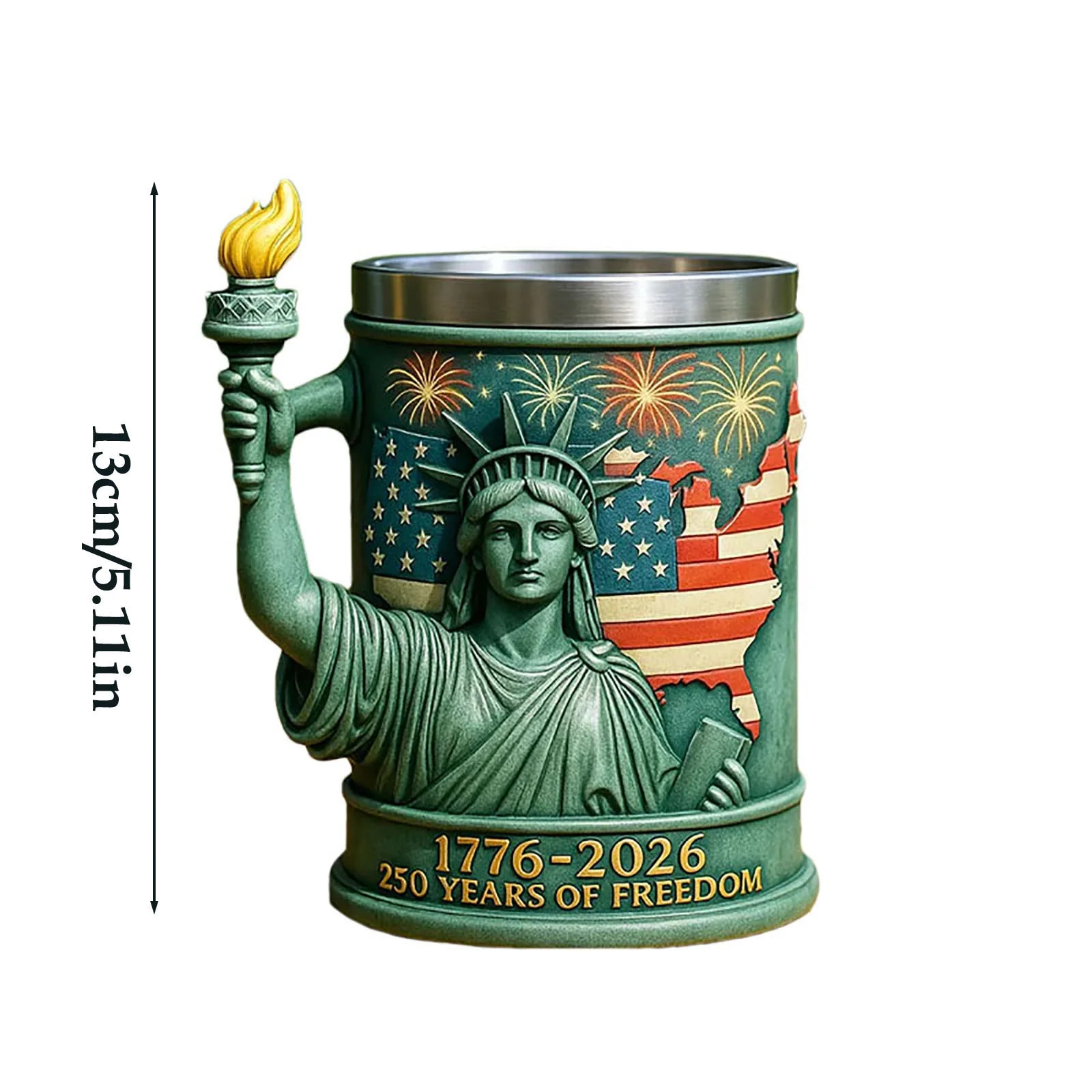 This mug incorporates a commemorative design inspired by the Statue of Liberty’s torch. It features raised dimensional detailing depicting figures holding torches, intended to evoke themes of light and hope. The handle is formed into the shape of an upraised arm, contributing to its visual concept. Constructed with an interior stainless steel liner, the mug is designed for durability. The base includes an engraving referencing its historical inspiration.