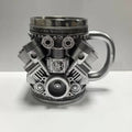This stainless steel mug features a detailed three-dimensional representation of a "V" type engine block, directly inspired by the design of iconic V6 and V8 engines. It is crafted for automotive enthusiasts and anyone with an appreciation for mechanical engineering and design.